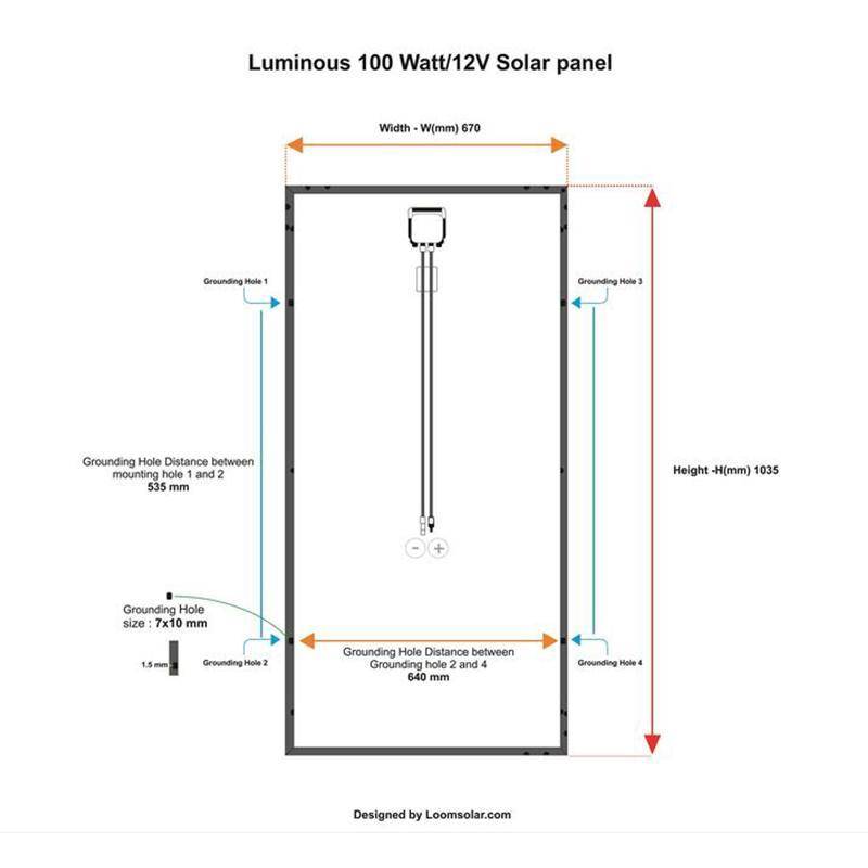 Luminous 100 Watt - 12 Volt solar panel is used to generate electricity from solar panels. It is connected with inverters, solar charge controllers, battery for generated electricity to make use in homes. The dimension of 100 watt solar panel is 3.3 feet and 2.1 feet, (length * width). it generates 5.5 amps current at peak power generation.